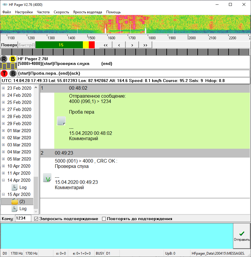 В верхнем окне показывается спектр принимаемого сигнала в виде водопада. Тонкие вертикальные линии в этом окне показывают граничные частоты приемных фильтров.